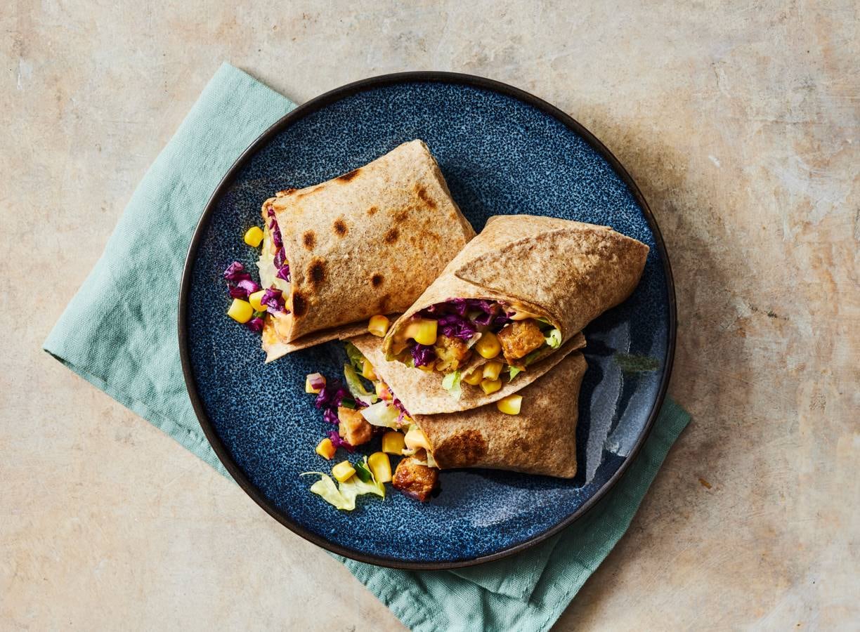 Wraps met ketjap-tempeh, kool en maissalsa