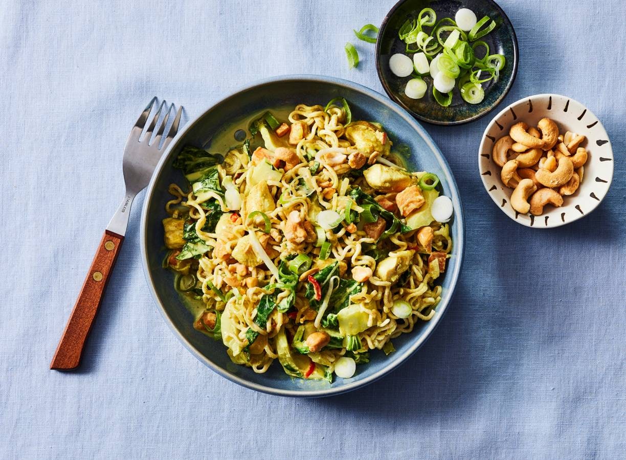 Kip-kerrie kennen we, maar deze variant met noedels is nét weer even anders. Door de volkorennoedels heb je wat extra vezels. Top af met cashewnoten en genieten maar!