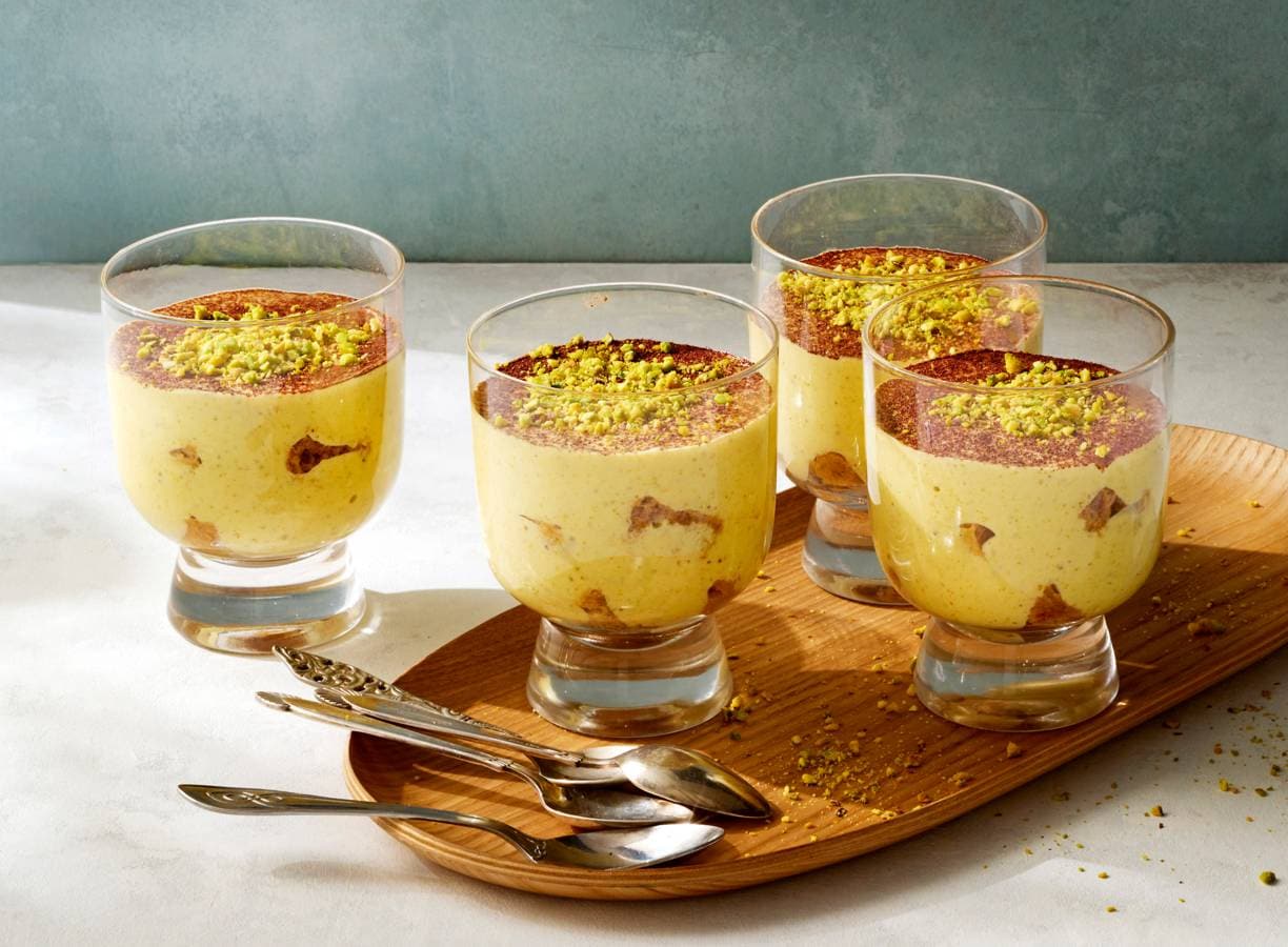 Maal de rest van de pistache zo fijn mogelijk. Verdeel over de glaasjes en serveer direct.