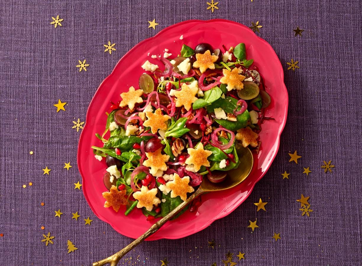 Deze kerstsalade is een echt feestje op tafel. Kleurijk dankzij de granaatappelpitjes on top en feestelijk dankzij de sterren-croutons.