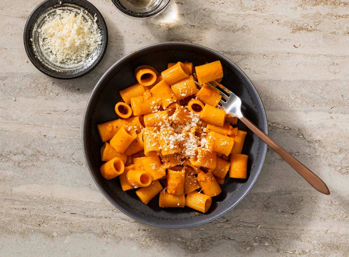 Rasp de kaas. Voeg de rigatoni toe aan de saus en voeg er zo veel pastawater aan toe dat het een smeuïge saus wordt (ca. 150 ml per 4 personen). Schep de helft van de kaas erdoor en verdeel over borden.