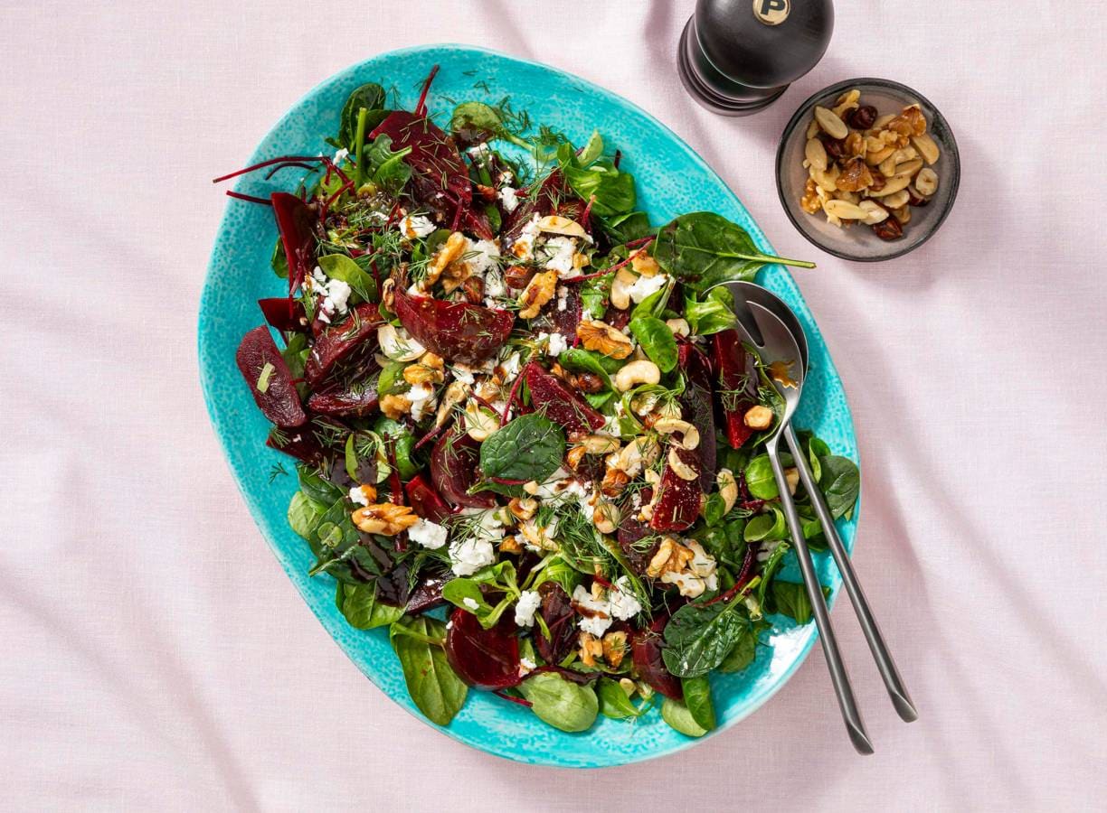 Biet, feta en dille staan aan de basis van deze kleurrijke bietensalade. Het zoetje van de biet, het romige van de feta, een krokantje van de walnoten. Deze salade is mooi in balans en bijzonder makkelijk te maken.