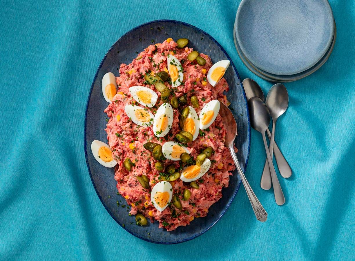 Meng de kip met de biet, halvanaise en aardappelpuree. Laat de maiskorrels uitlekken. Schep de zilveruitjes, fijngesneden augurk en maiskorrels erdoor en schep de salade op een schaal.