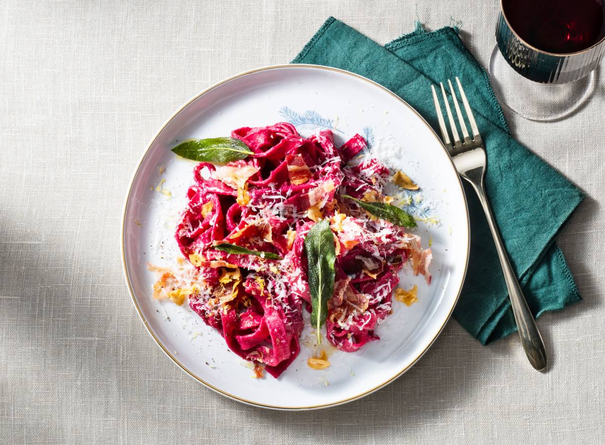 Deze tagliatelle is rijk van smaak dankzij de bieten, pancetta, salie en pecorino. Dat vraagt om een stevige doch soepele wijn als tegenhanger. Proost!