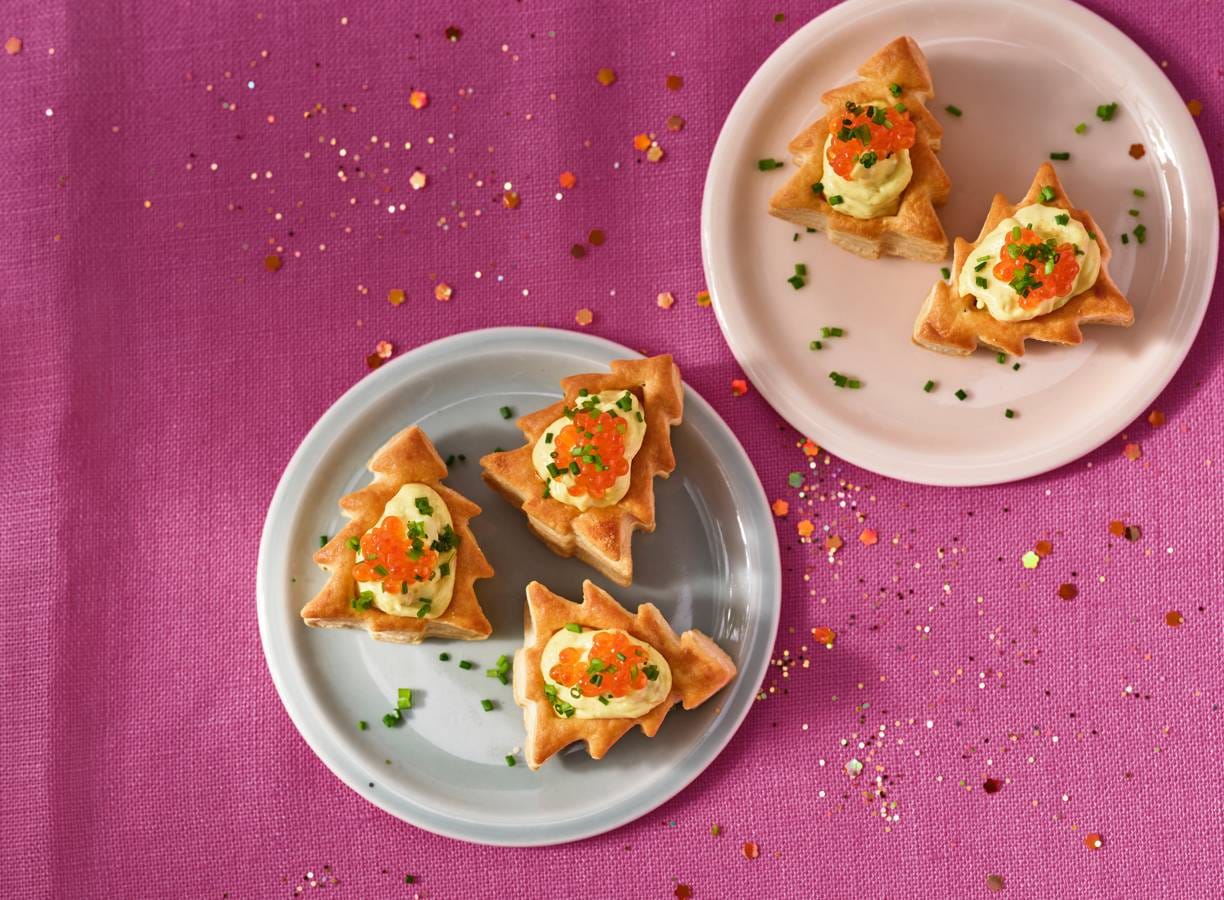 Deze borrelboompjes met gevuld eitjesalade en zalmforeleitjes zijn niet alleen een feest voor het oog, maar ook een ware smaaksensatie. Laat de kerst maar komen.
