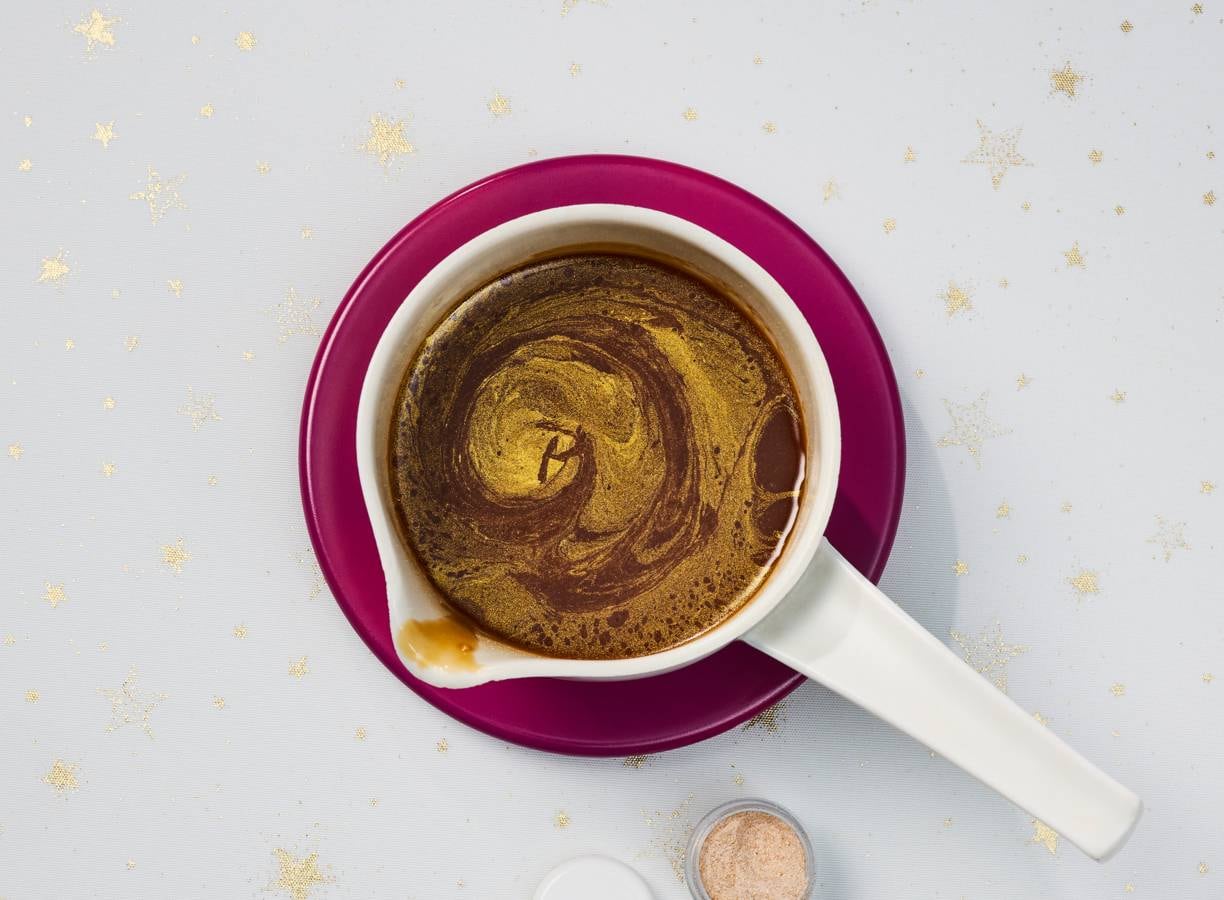 Geef wat extra bling aan je kerstdessert met deze simpele maar oh zo lekkere glitter-karamelsaus. Het is immers feest!