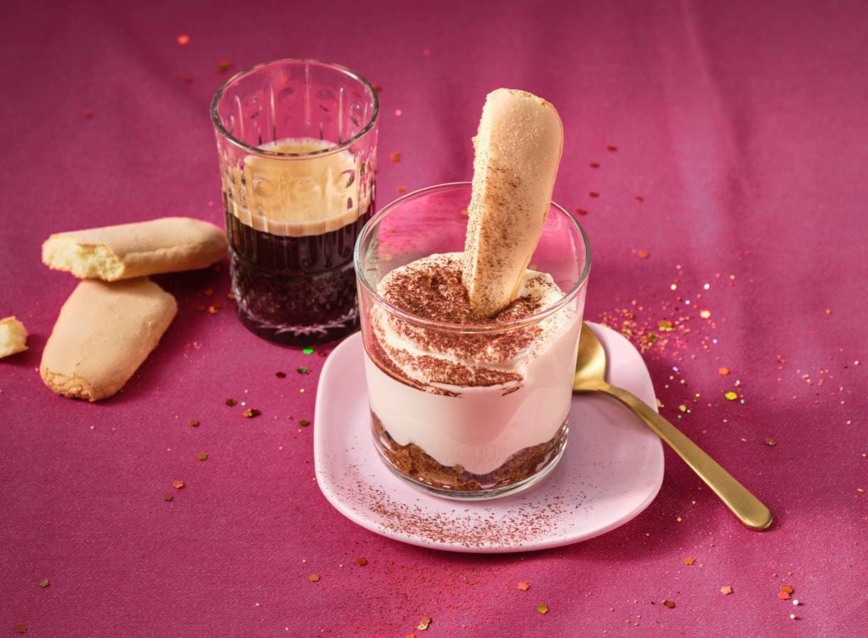 Deze versie is zonder ei, maar natuurlijk wel met marsala, espresso en rijkelijk bestrooid met cacaopoeder. Bijna zoals een klassieke tiramisu.