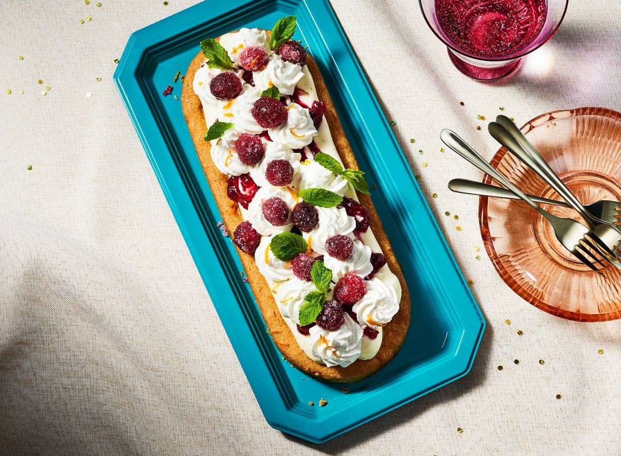 Spuit de cheesecakevuling in lange banen op de sloffenbodem. Verdeel de cranberrysaus over de cheesecakevulling en maak met de satéprikker een zigzagbeweging voor een marmereffect. Spuit hierover toefjes slagroom en verdeel de gesuikerde cranberry’s erover. Pluk de blaadjes van de takjes munt. Garneer met de rest van het sinaasappelrasp en de munt.
