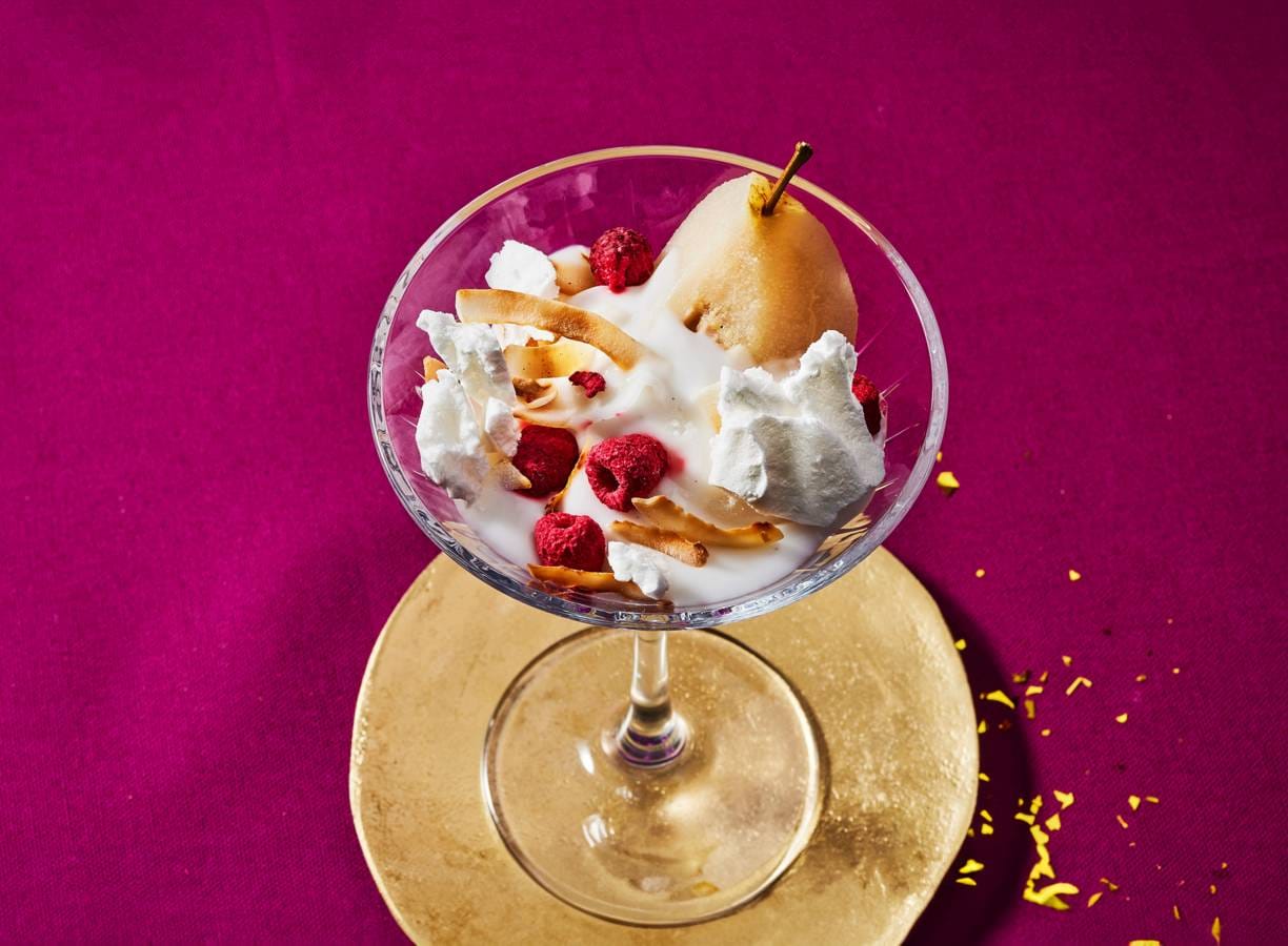 Breek de meringue in grove stukken. Zet een stukje stoofpeer rechtop in de coupes. Maak in de coupes meerdere laagjes met de meringue, kokosgurt, kokossnippers en frambozen. Herhaal tot alles op is.
