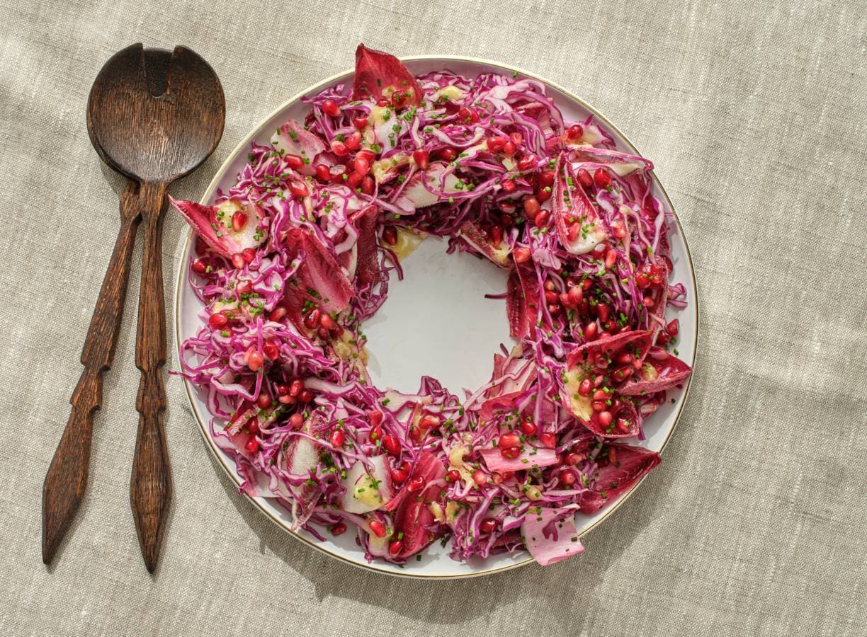 Meng de dressing met de rodekool, roodlof en de helft van de bieslook en verdeel in een kransvorm over een schaal. Bestrooi met de granaatappelpitjes en de rest van de bieslook.