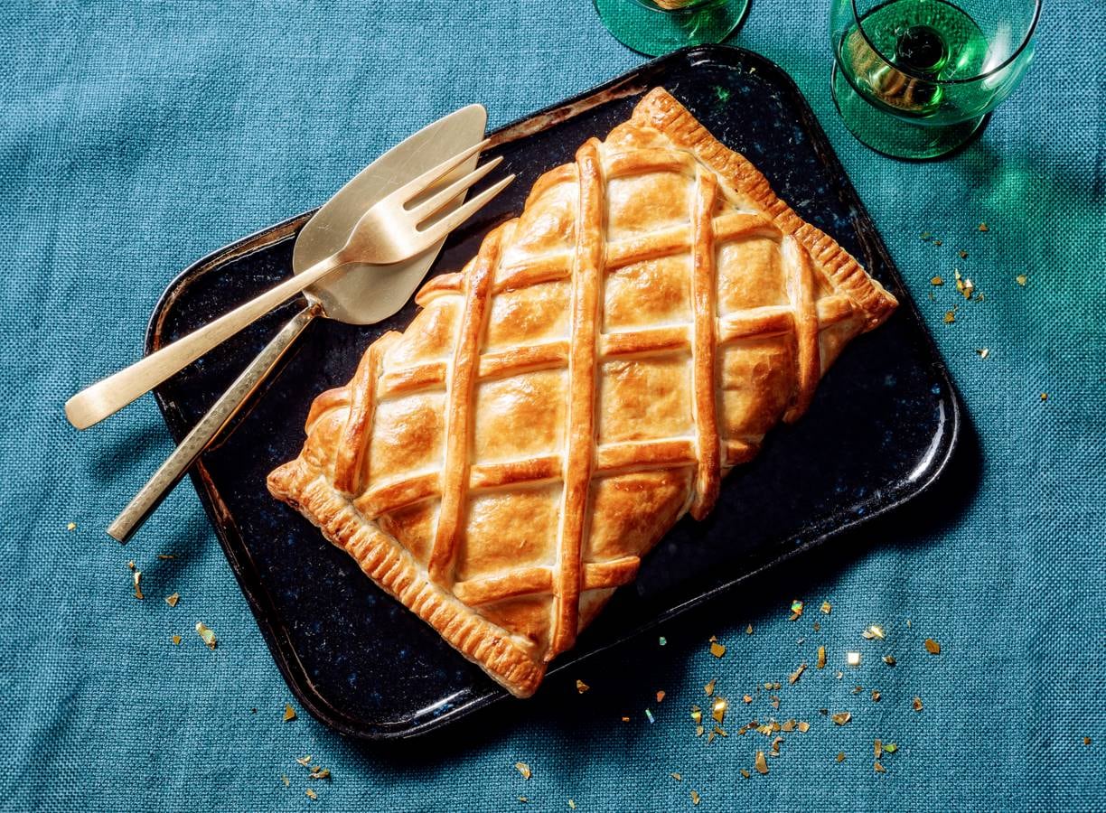Snijd het afgesneden deeg in lange repen en leg in een ruitvorm op de wellington. Klop het ei los en smeer de wellington met een bakkwast ermee in. Bak 45-50 min. in de oven tot lichtbruin en gaar. Haal uit de oven en serveer direct.