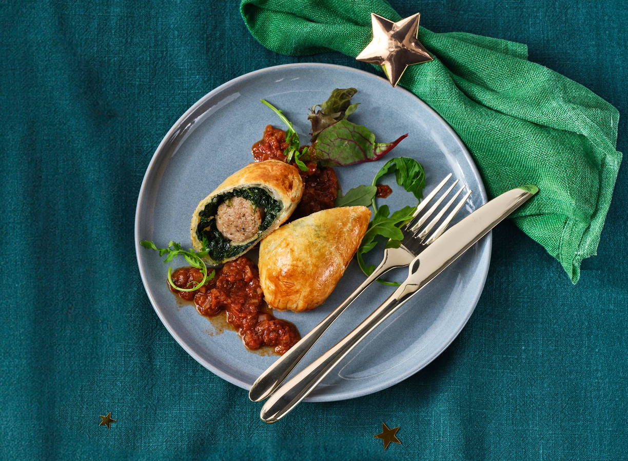 Halveer het bladerdeeg in de lengte en breedte, zodat je 4 gelijke rechthoeken hebt. Beleg met de gebakken spinazie en de pecorino. Hou 2 cm van de randen vrij. Leg een worstje op de korte kant van het deeg en rol op. Snijd het overtollige deeg aan de zijkanten af en knijp de randjes en de onderkant goed dicht.