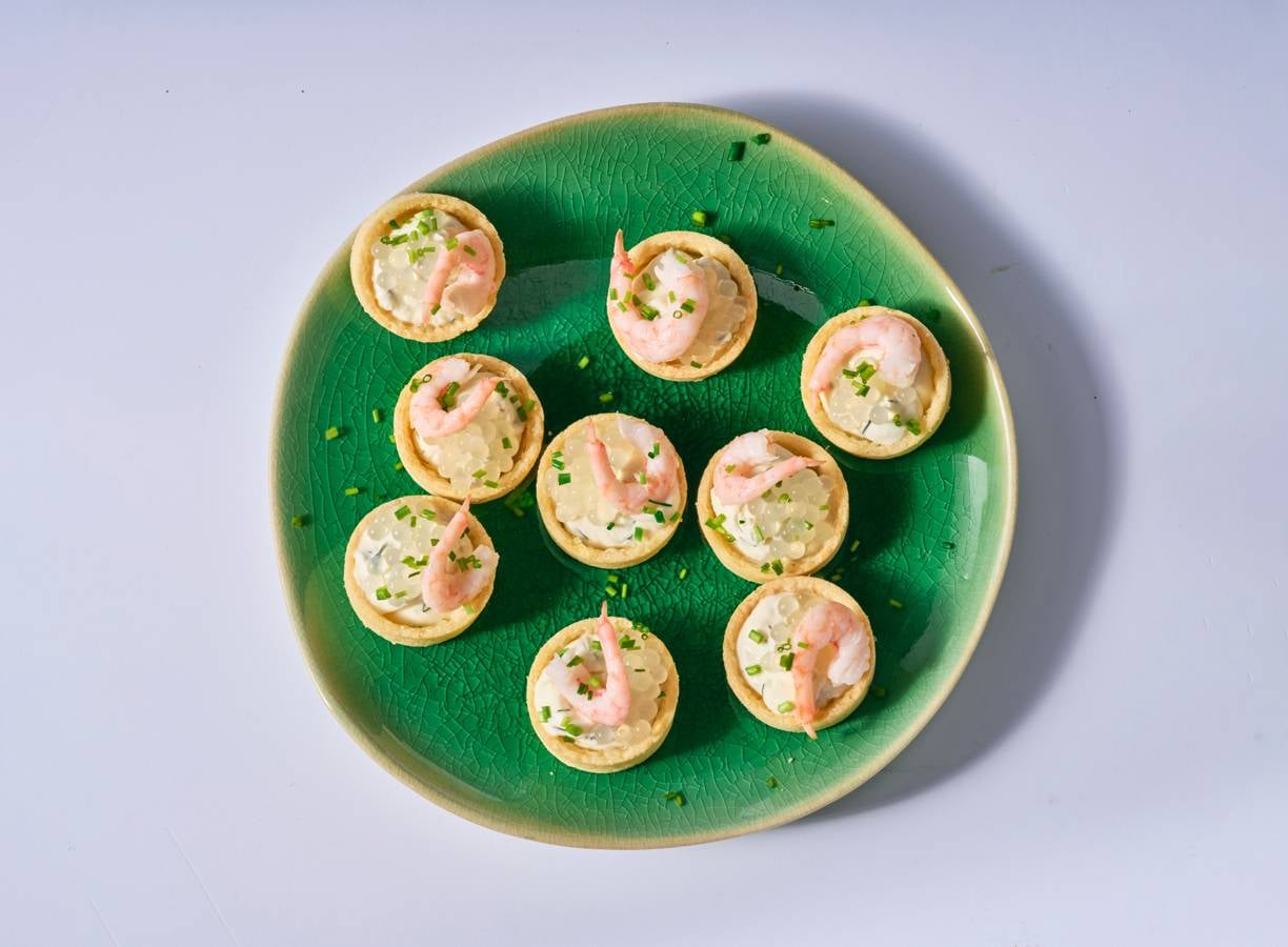 Spuit de roomkaas citroen-dille in de tartelettes. Verdeel er een garnaal en de smaakparels erover.