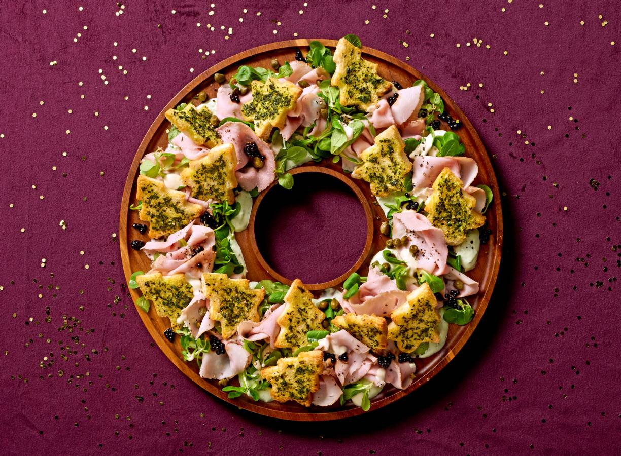 Vitello tonnato met kerstboomtoast en balsamicoparels
