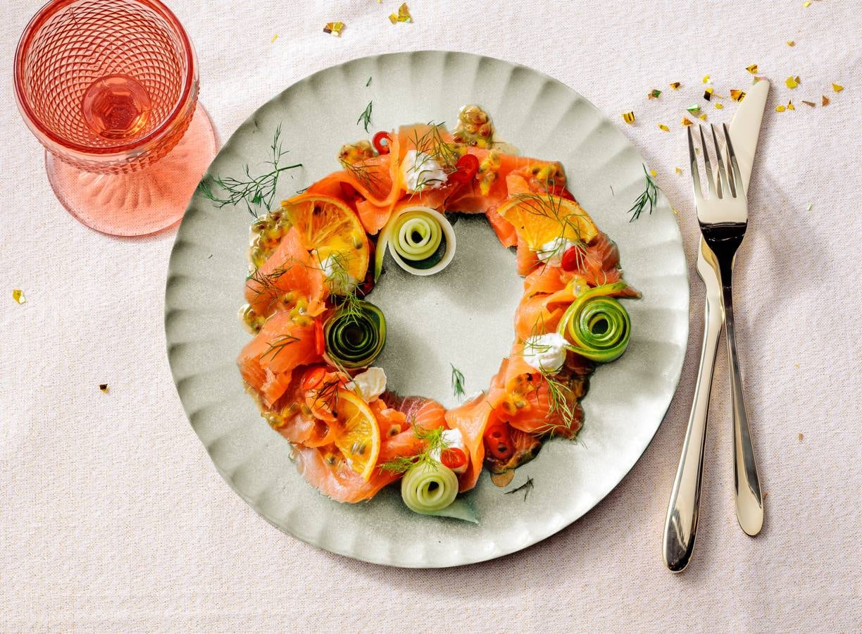 De dressing is gebaseerd op de cocktail pornstar martini (oftewel poma). Die doet het ook goed in dit voorgerecht met zalm!