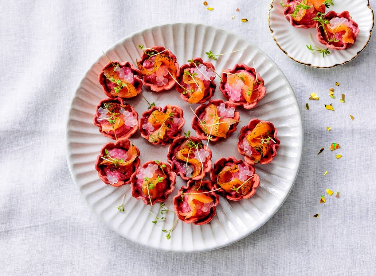 Biet, zalm en mierikswortel zijn een gouden trio in dit hapje. Extra feestelijk in deze rode cups, afgemaakt met smaakparels.
