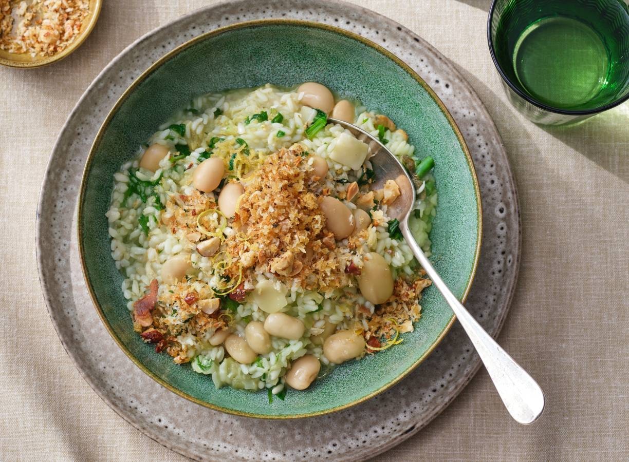 Limabonen zijn romig en heel veelzijdig door hun milde smaak. Ze passen dan ook perfect bij een romige risotto met frisse citroen en een knapperige notentopping.