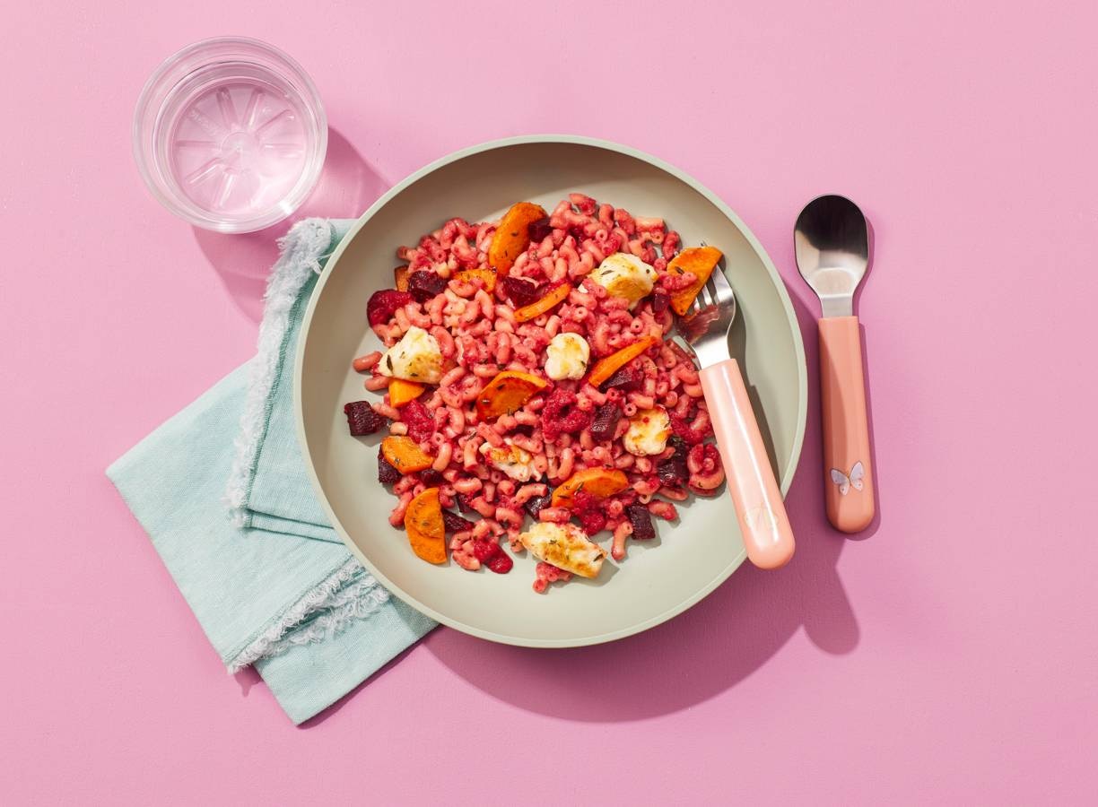 variatietip:Maak voor baby’s (8+ maanden) een hapje van wortel, rode biet en macaroni. Voeg een paar druppels olijfolie toe.