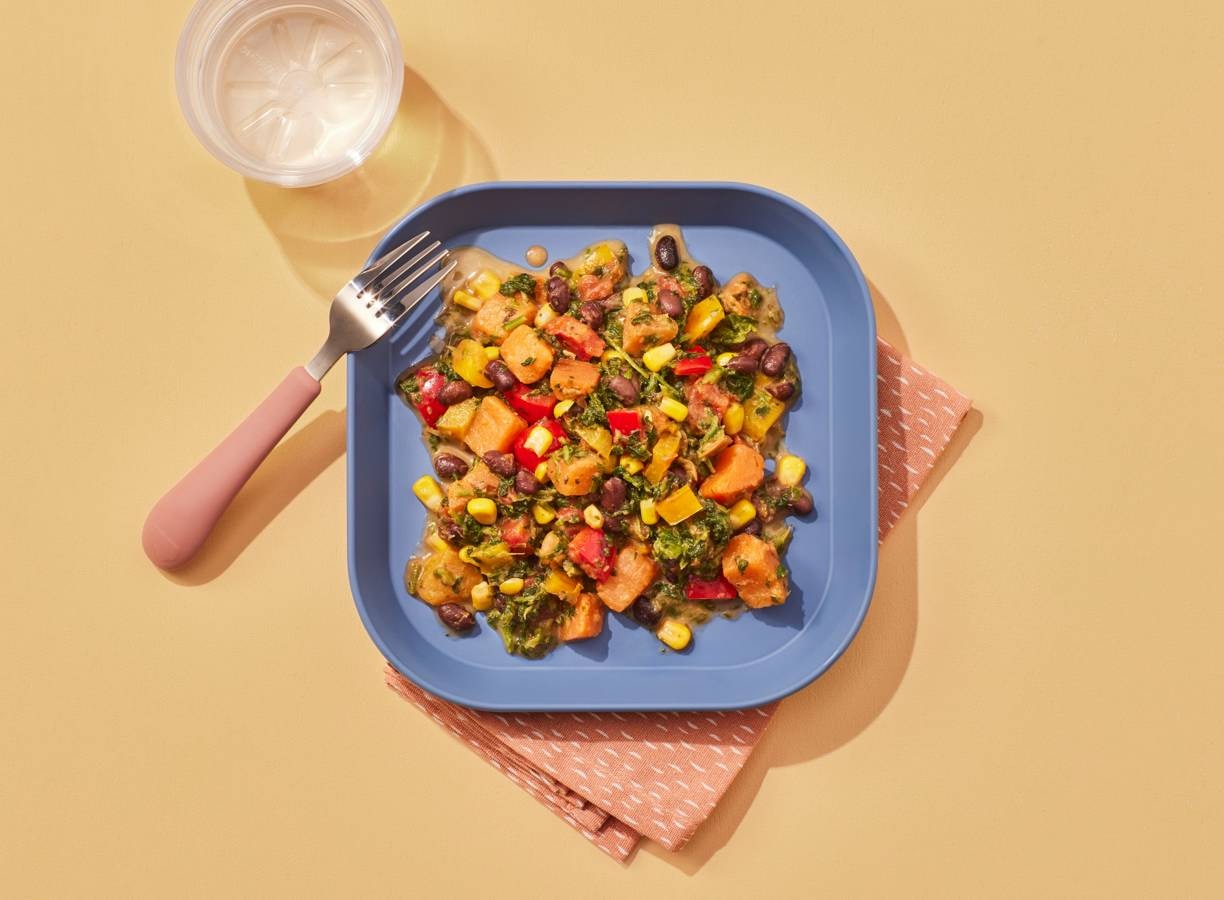 Koken met Kindergarden: Een smakelijk en voedzaam gerecht met zoete aardappel, zwarte bonen, maïs en tomaat. Een favoriet op de kinderopvang én makkelijk thuis te maken!