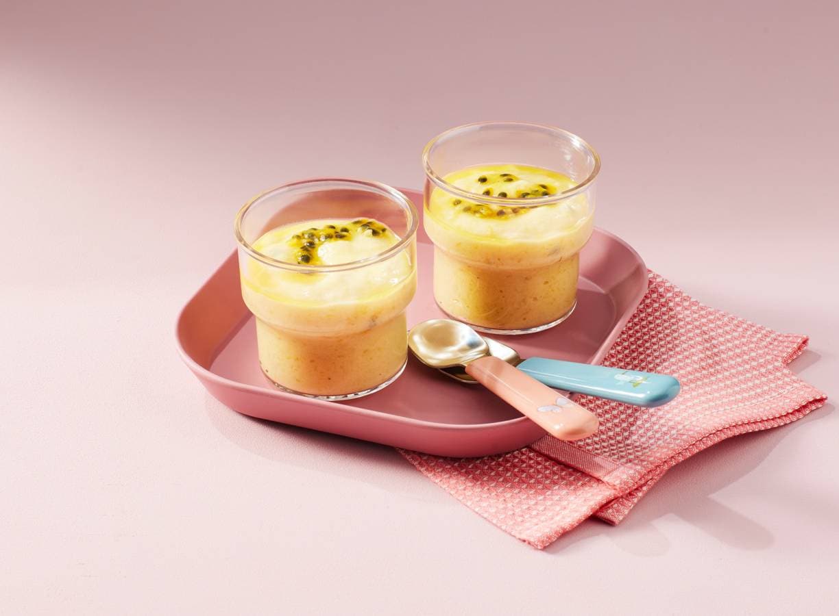 Doe de pastinaak, mango, passievrucht, bananen en de (plantaardige) kwark in een keukenmachine en maal tot een egale puree. Giet in een kommetje en versier met toppings naar wens.