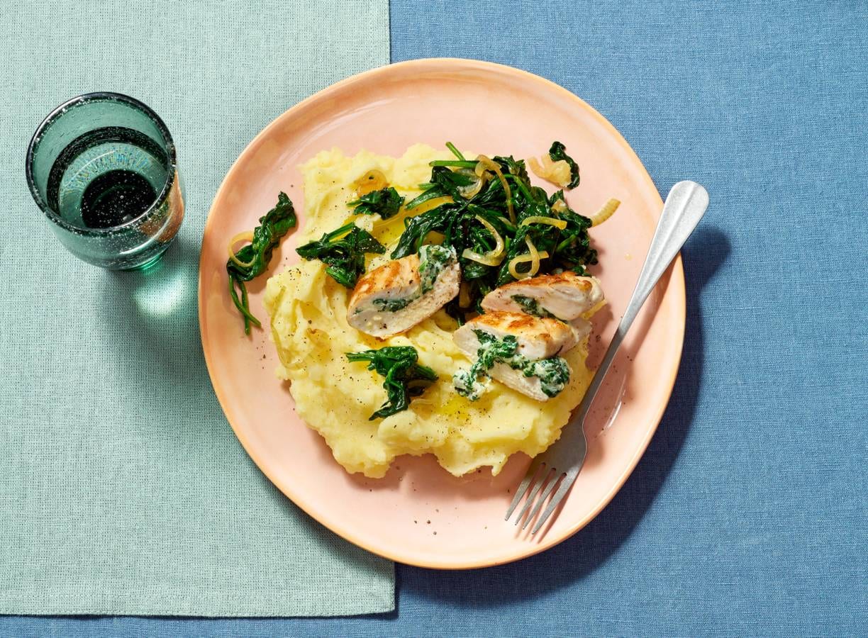 Gevulde kip met romige spinazie en aardappelpuree