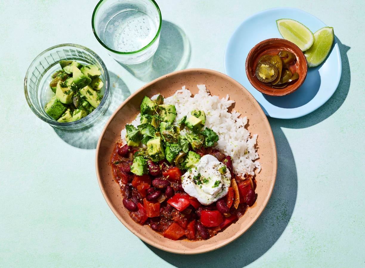 'Sin carne' zegt het al: zonder vlees. Deze vegan chili sin carne met kidneybonen en rode paprika maak je af met een frisse avocadosalsa en een schep plantaardige crème fraîche.