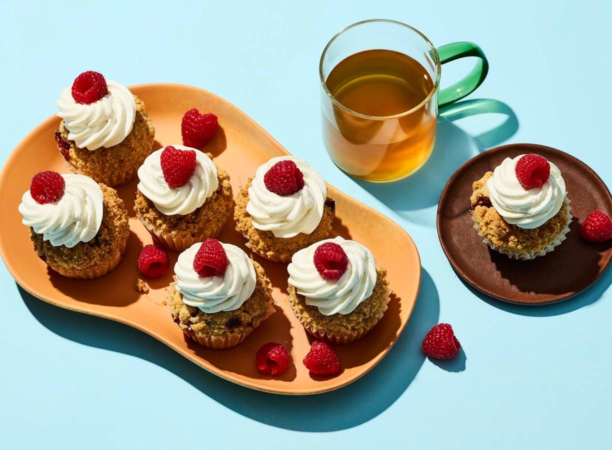 Klop de rest van het plantaardige alternatief voor slagroom met de rest van de suiker stijf. Serveer de muffins met het plantaardige alternatief voor slagroom en de rest van de frambozen.