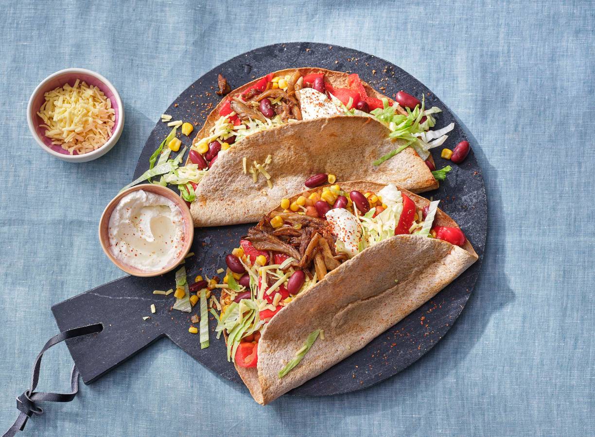 Verwarm de tortillawraps volgens de aanwijzingen op de verpakking. Verdeel de ijsbergsla, het bonenmengsel en de oesterzwam erover. Verdeel de sour cream erover en bestrooi met de tajín en plantaardige rasp en rol op.