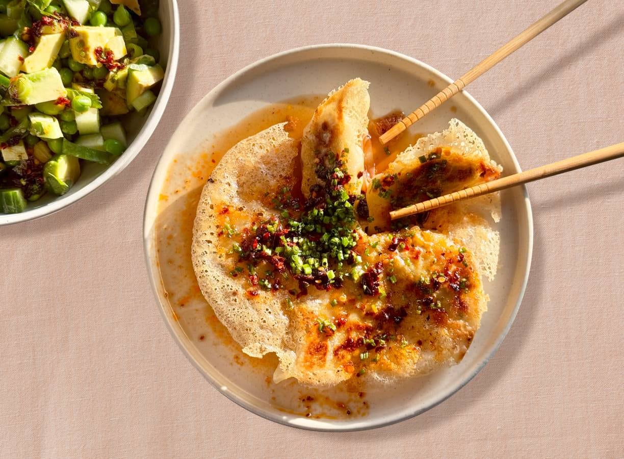 Gyoza met een lekker crispy bodempje, daar kun je ons én Veggilaine voor wakker maken. Lekker met een frisse salade van tuinerwten.