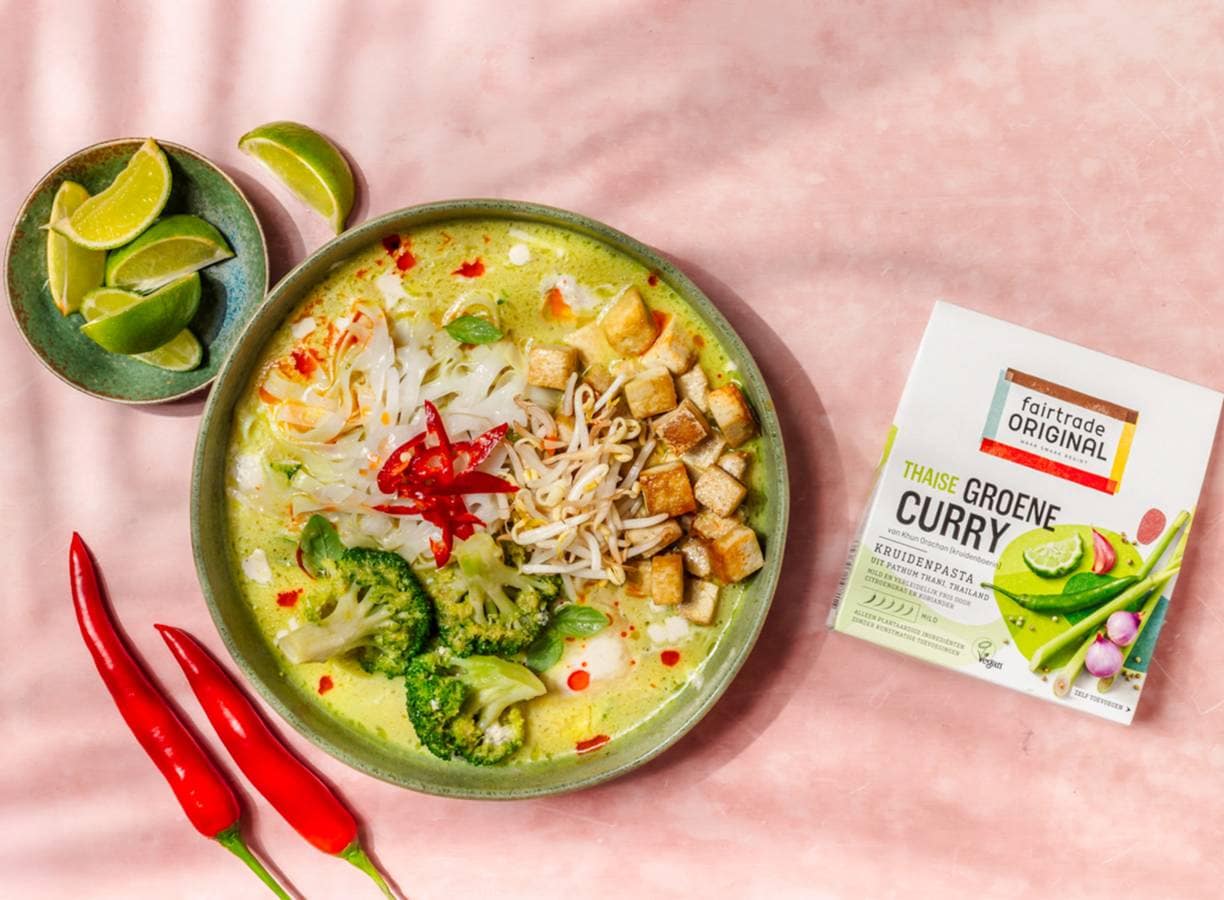 Koken met Fairtrade Original: Mmm, groene currysoep. En wat voor één! De soep is mildpittig en mega romig. Met tasty tofu en de bite van verse groenten. En noedels niet te vergeten. We garanderen je: een dampende kop van deze soep wordt sowieso genieten.