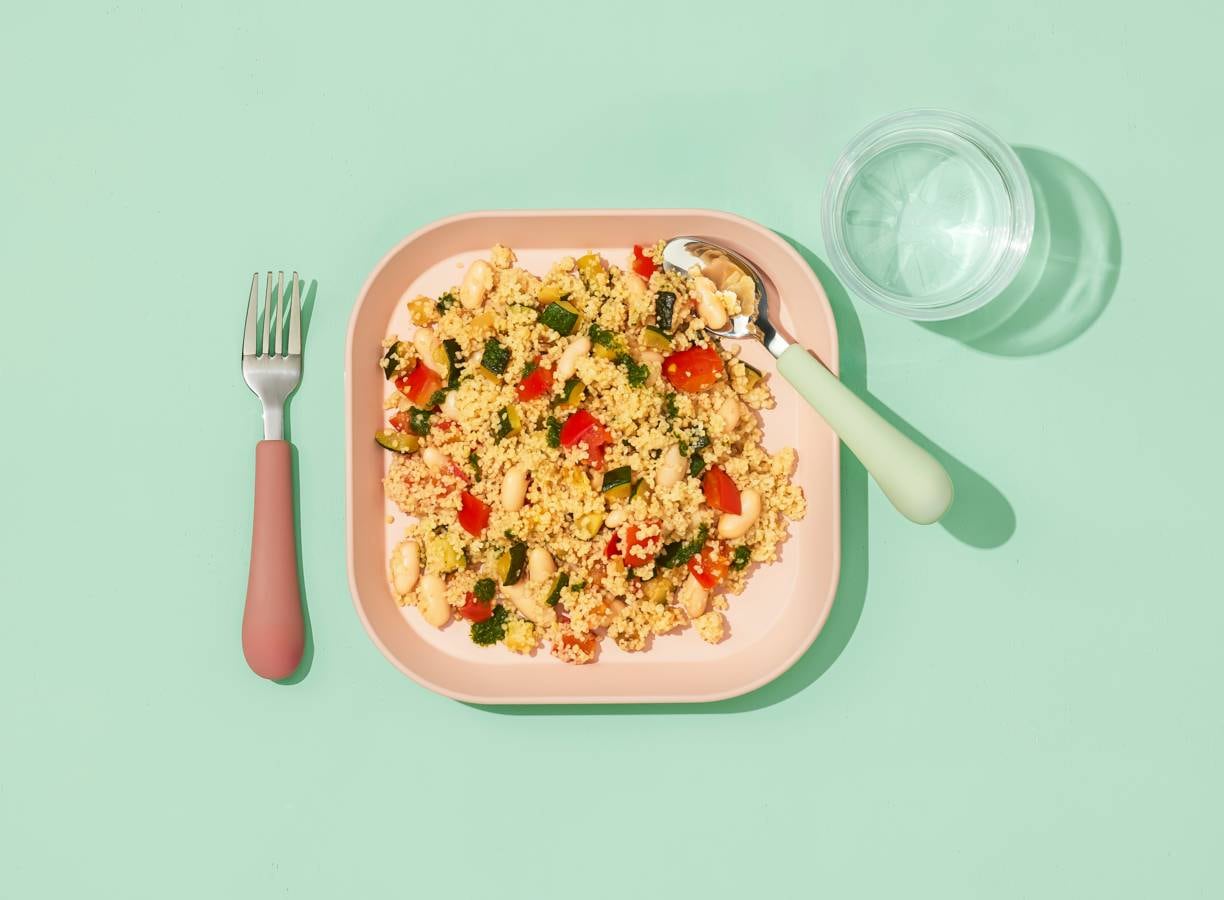 Koken met Kindergarden: Een kleurrijke couscous met courgette, tomaat en cannellinibonen. Mild en voedzaam voor kinderen, maar met simpele extra’s ook verrassend lekker voor volwassenen!