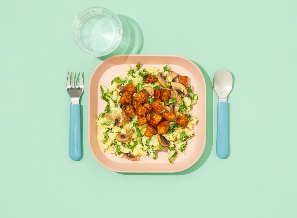 Koken met Kindergarden: Een voedzame en smeuïge stamppot van aardappelen en snijbonen, met een verrassende bite van champignons en tempeh. Mild en lekker voor kinderen maar geschikt voor het hele gezin!