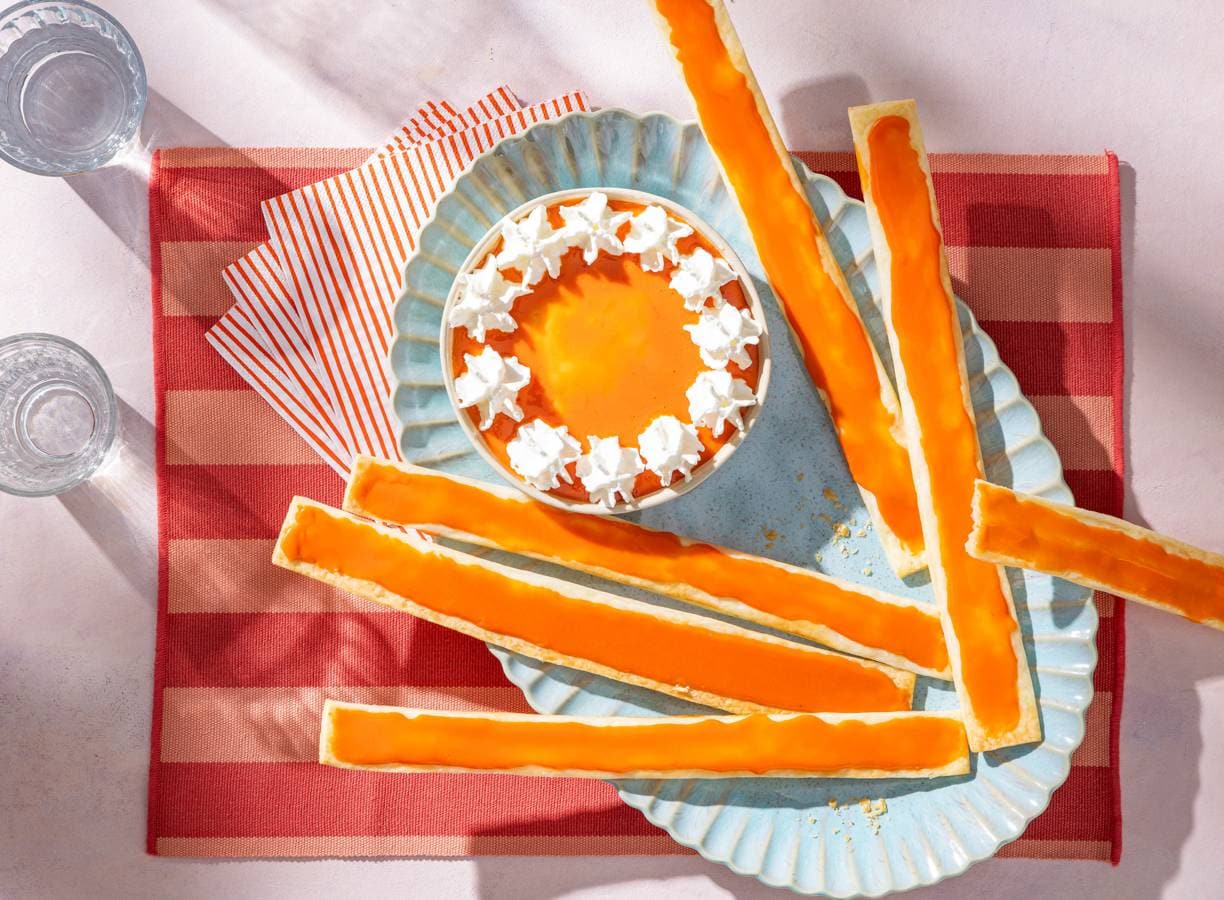 Schep de banketbakkersroom in een kom en strijk de bovenkant glad. Verdeel de rest van het glazuur er gelijkmatig over. Roer eventueel wat extra sinaasappelsap door het glazuur als deze ingedikt is. Spuit er rondom toefjes slagroom op. Serveer met de bladerdeegstengels.