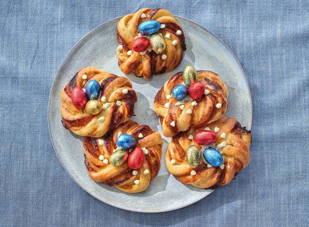 Controleer met de satéprikker of de babka’s gaar zijn: steek de prikker er in het midden in. Komt de prikker er schoon uit, dan zijn ze gaar. Haal de babka’s uit de oven, bestrijk direct met de honingsiroop en bestrooi met de chocoladedruppels. Laat 5 min. afkoelen op de plaat en laat vervolgens 30 min. volledig afkoelen op een rooster. Verdeel de paaseitjes over de kuiltjes.