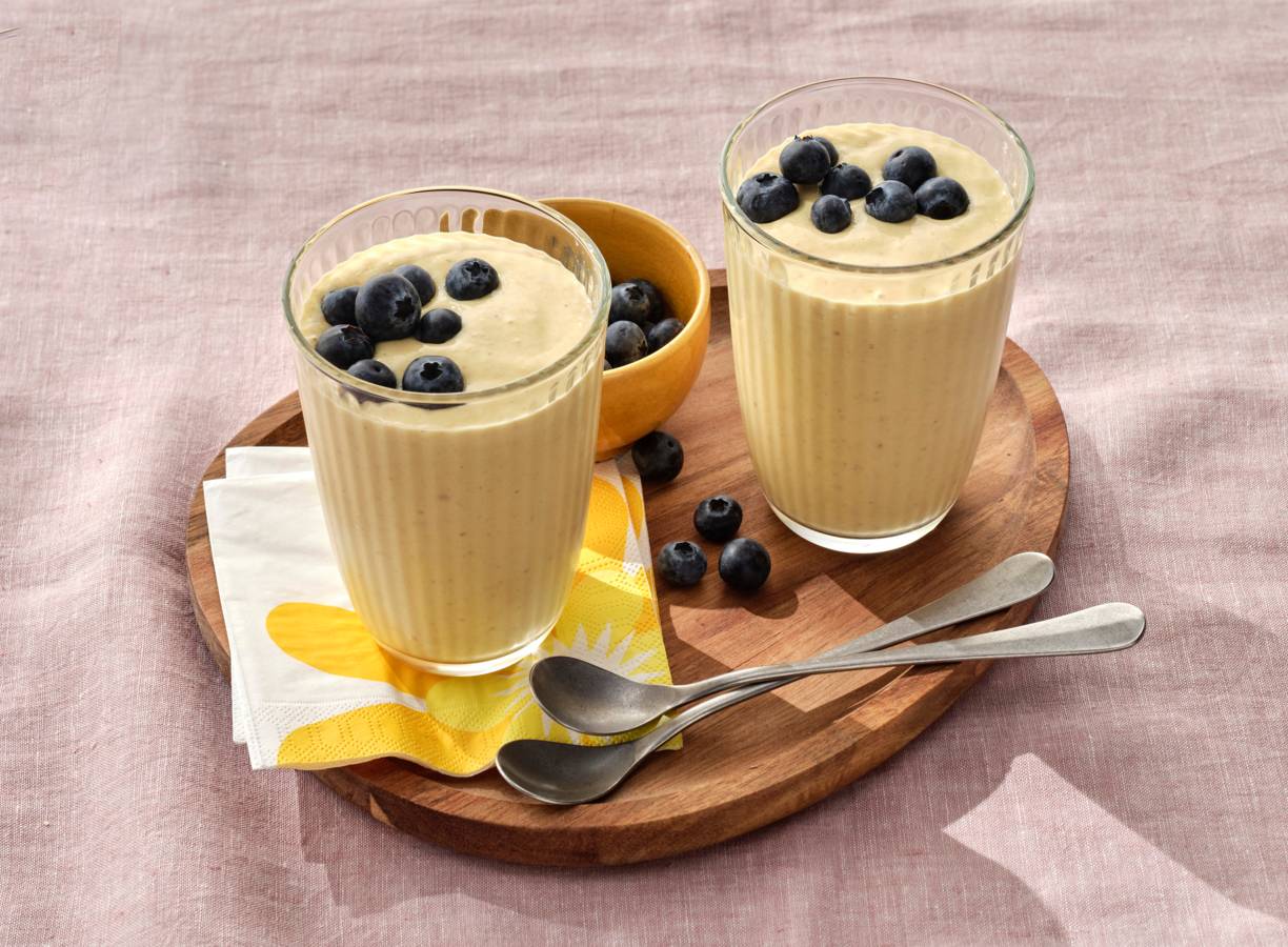 Ga voor een fruitige start van de dag met deze smoothie van mango, banaan, volkoren havermout en yoghurt. Lekker met verse blauwe bessen!