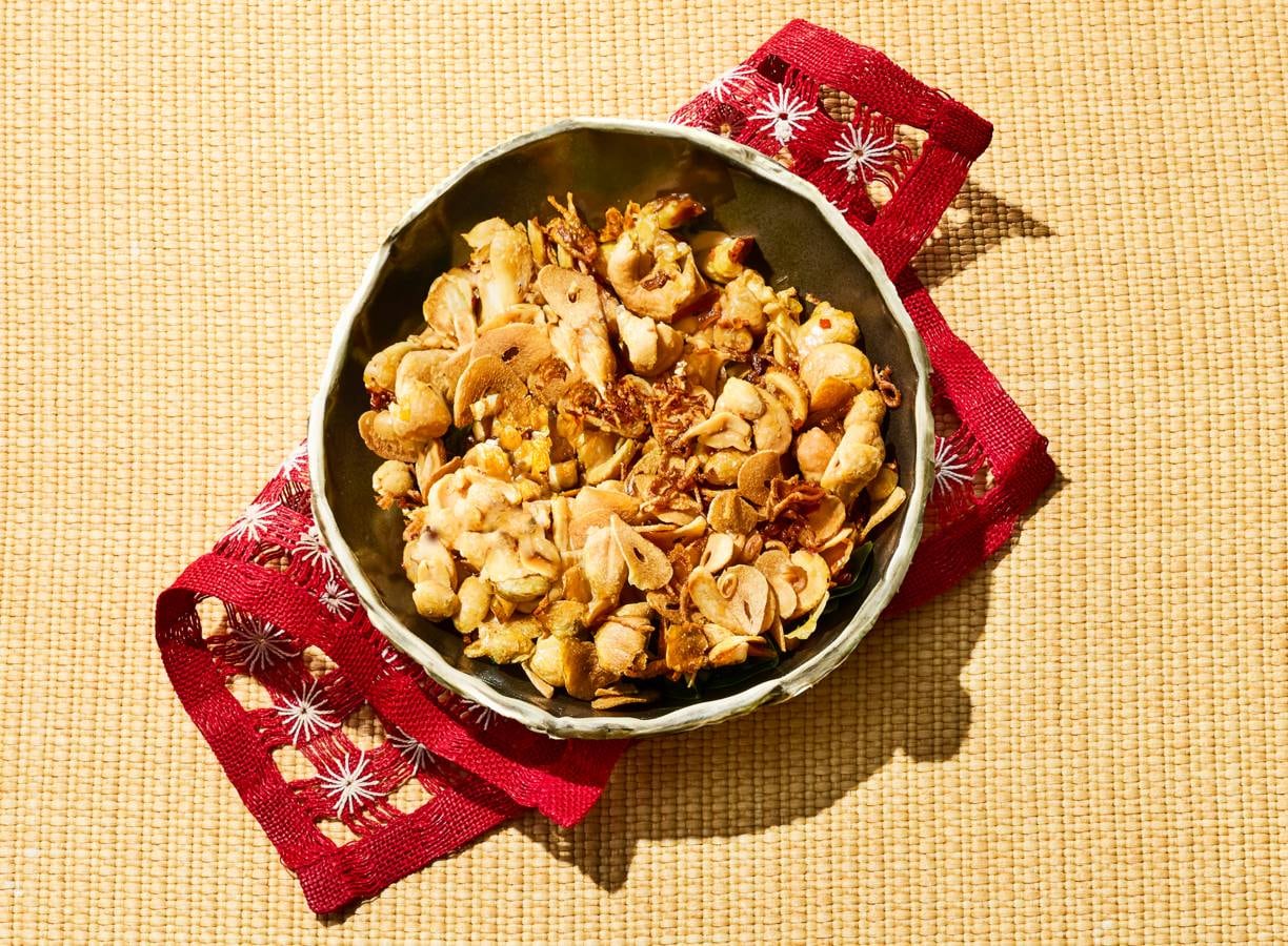 Fijne knabbel bij de borrel of als tussendoortje: je eigen geroosterde notenmix! We combineren deze mix van cashews en pinda's met krokante sjalotjes en knoflook.