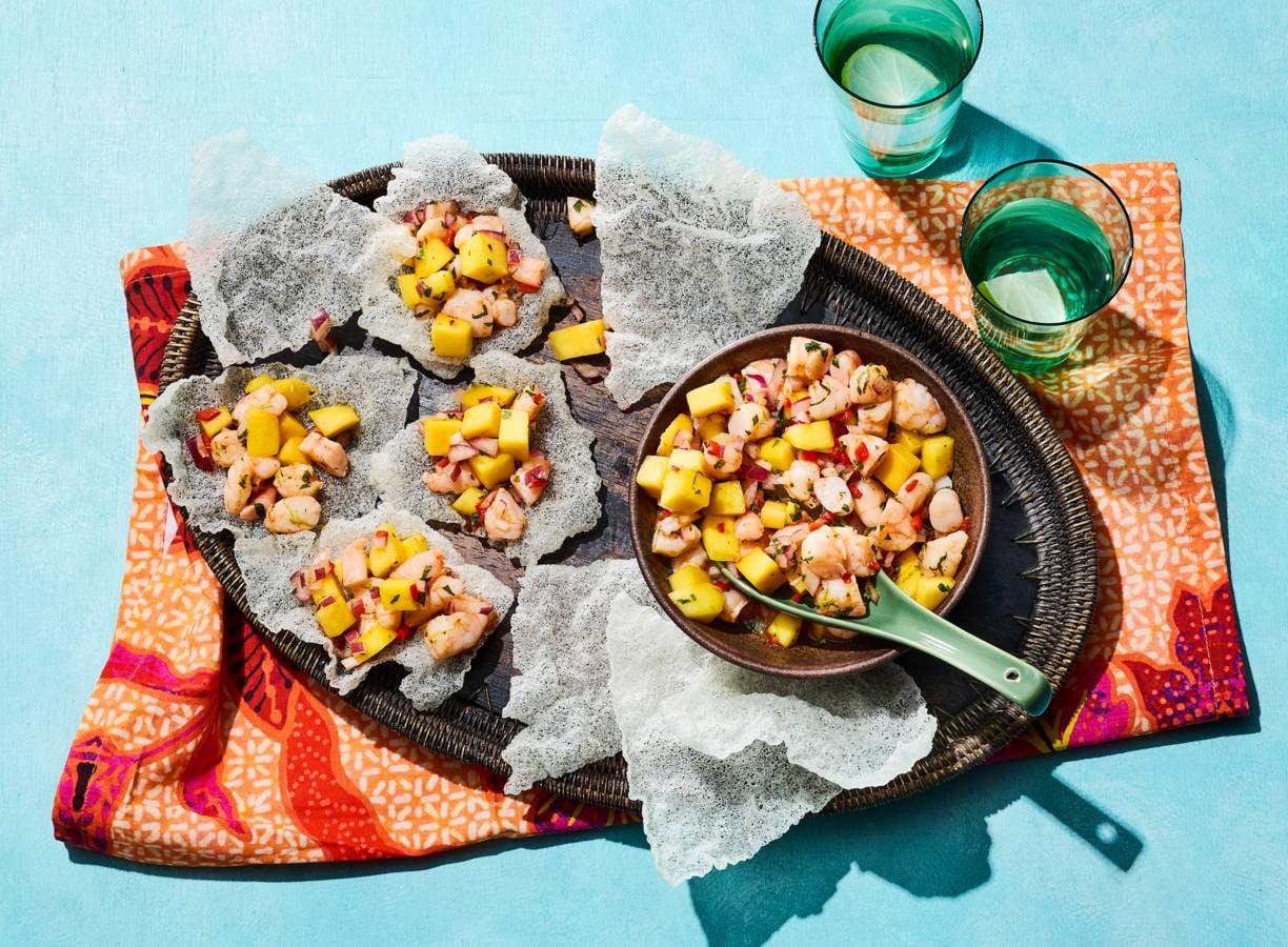 Wist je dat je rijstvellen ook kunt frituren? Je krijgt dan een flinterdunne 'cracker' die je kunt beleggen met allerlei lekkers zoals deze frisse topping van mango, garnalen en limoen.