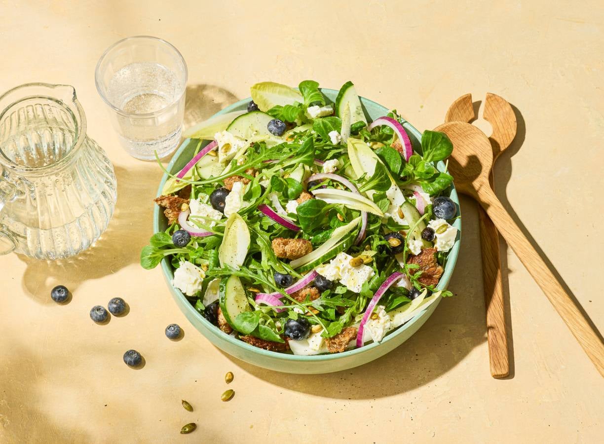 Verfrissende salade met zoete blauwe bessen, licht bittere witlof en knapperige komkommer. Een kleurrijke combinatie die perfect is als lichte lunch of als bijgerecht bij het paasdiner.