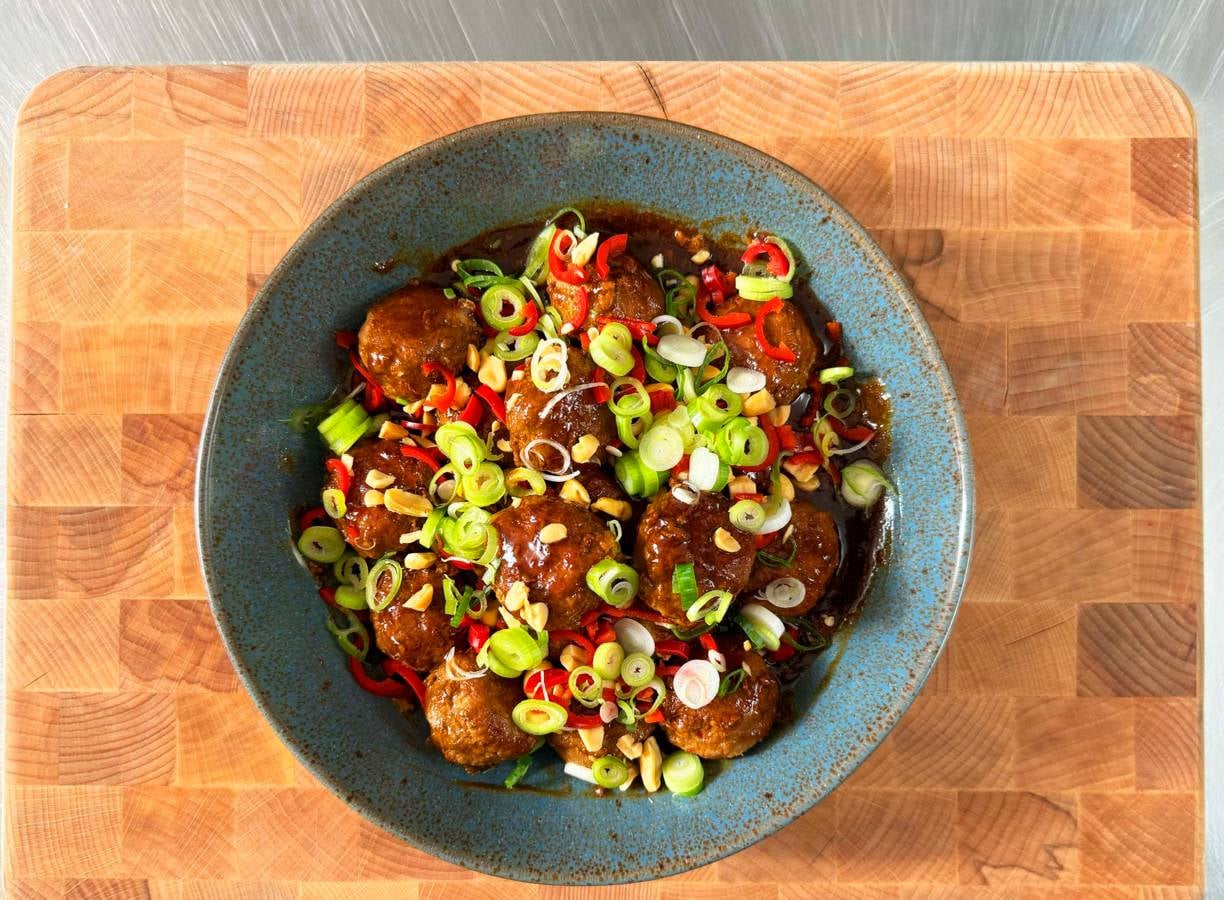Deze sticky gehaktballetjes staan zo op tafel! Bestrooi ze met peper, bosui en pinda's voor wat pittige crunch.