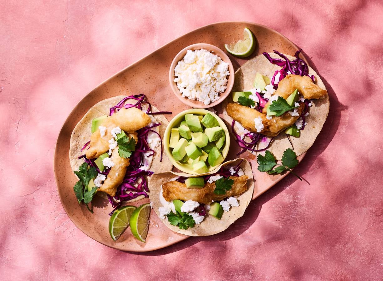 Zo’n opgevouwen taco met crunchy vis en mooie kleuren van de rodekool, limoen en witte kaas maken dit bijna een cadeautje, zo mooi. En nog belangrijker: ook heel smaakvol!