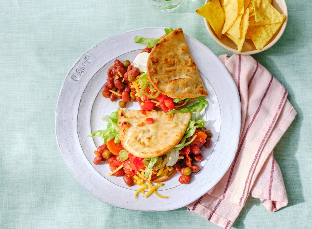 Verdeel de bonenschotel over de flatbreads. Verdeel de geraspte kaas, tomatenblokjes, sla, crème fraîche en jalapeñoplakjes erover, vouw dubbel en serveer met de tortillachips.