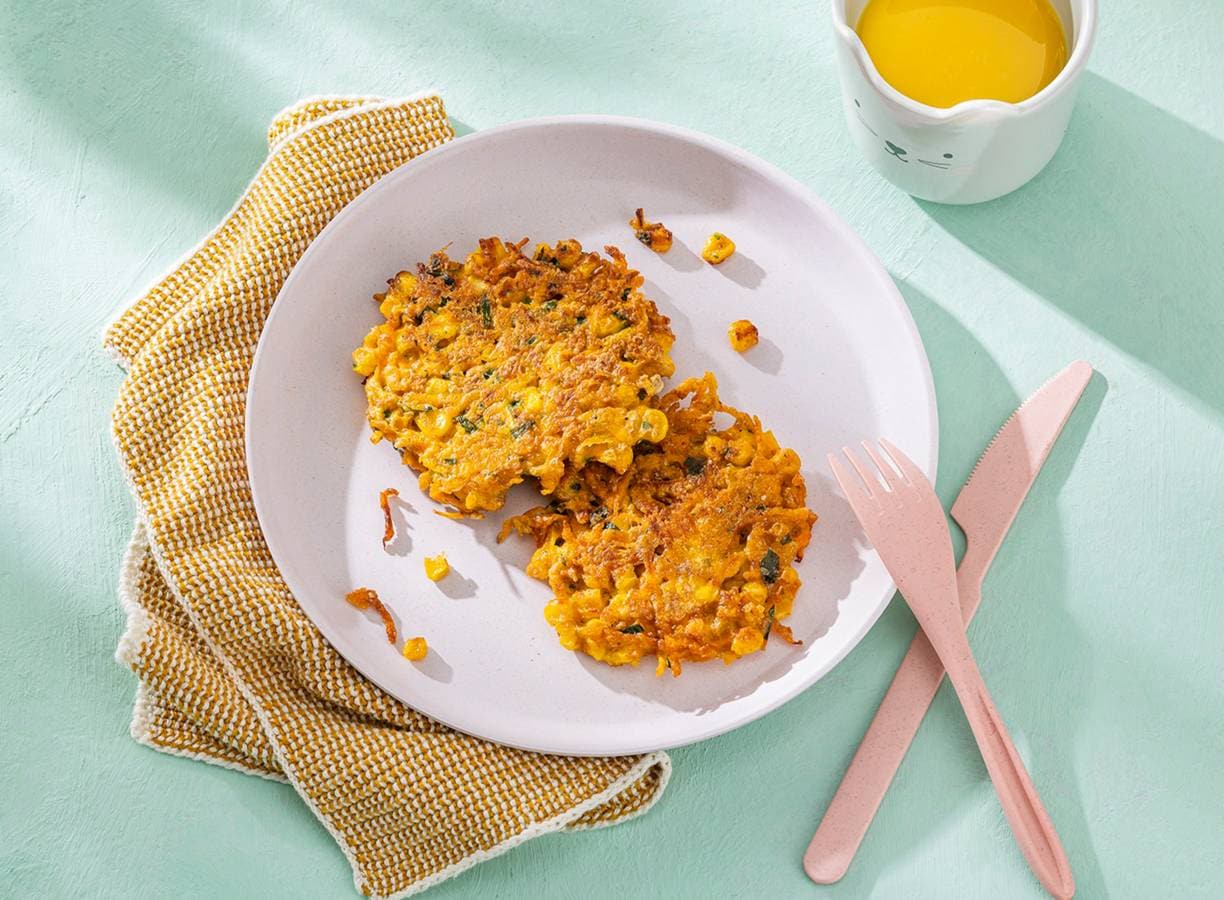 Een tussendoortje moet kunnen, al helemaal als het groentekoekjes zijn! Deze mais-wortelkoekjes heb je al tijdens hun middagdutje gemaakt.