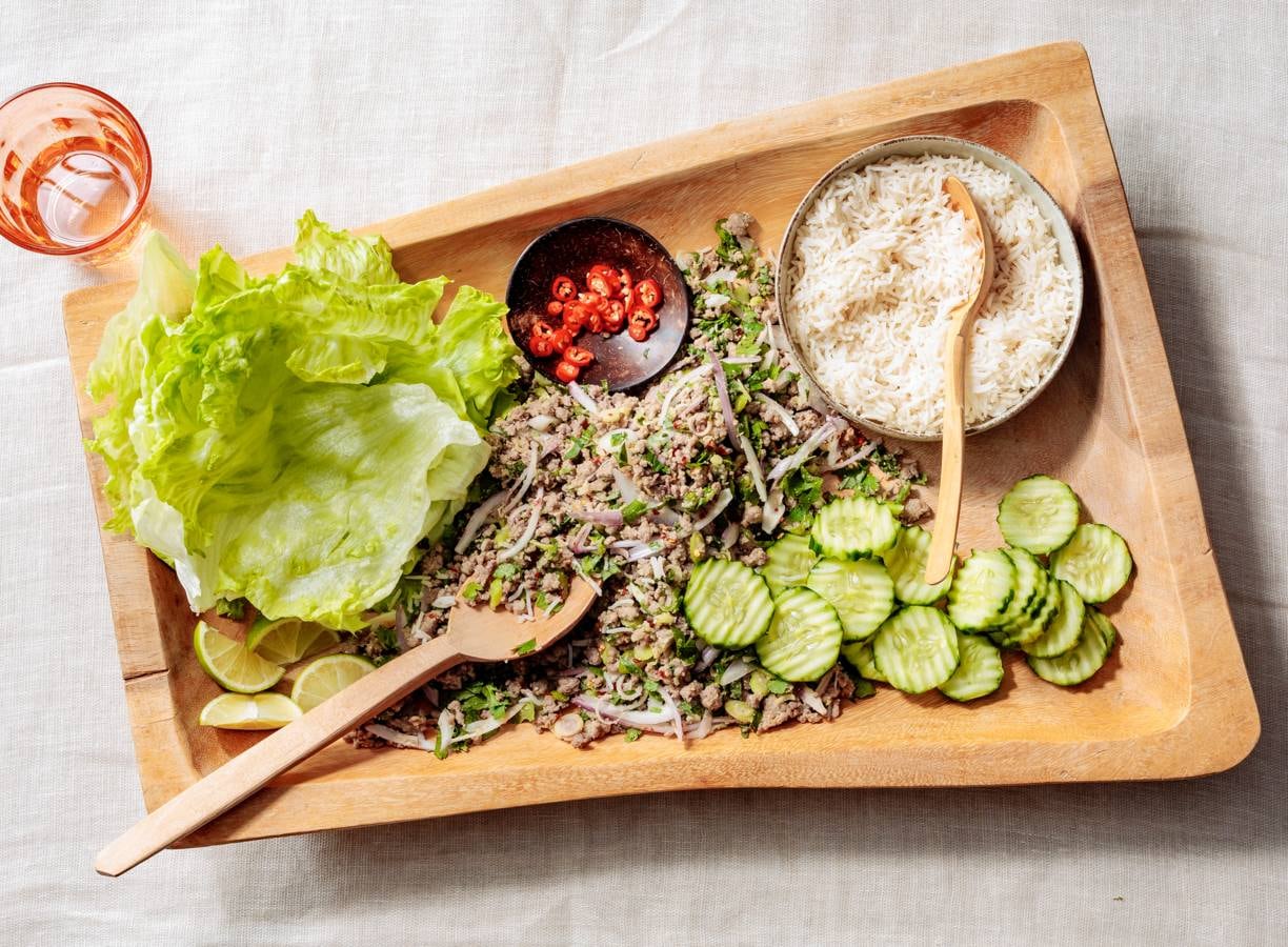 Laab is een traditioneel Laotiaans en Noordoost-Thais gerecht. Deze pittige, kruidige gehaktsalade serveer je als slawrap en breng je op smaak met limoensap, vissaus, gemalen geroosterde rijst (khao khua), chili en koriander.