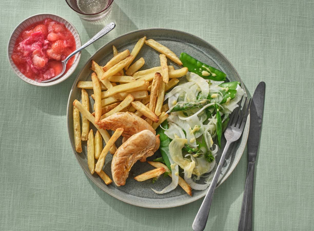 Serveer de friet met de kip, salade en appel-rabarbermoes.