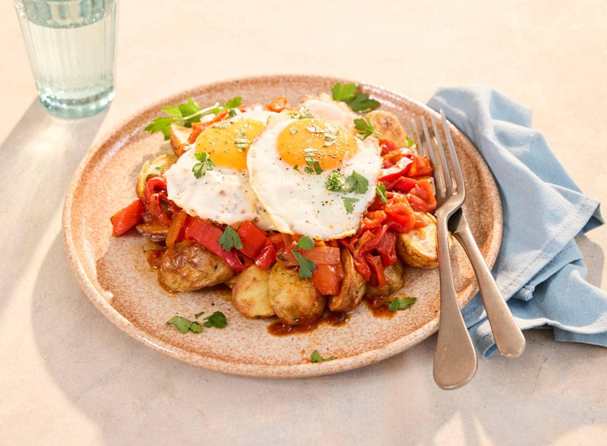 Paprika heeft in dit gerecht de hoofdrol. Deze warme en zomerse stoof serveer je met geroosterde krieltjes en gebakken eieren.