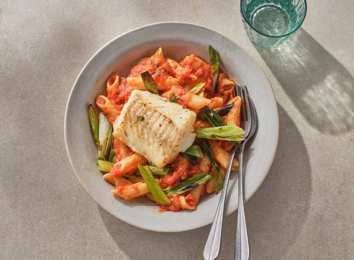 Penne met geroosterde-tomatensaus en kabeljauw van Hugo Kennis