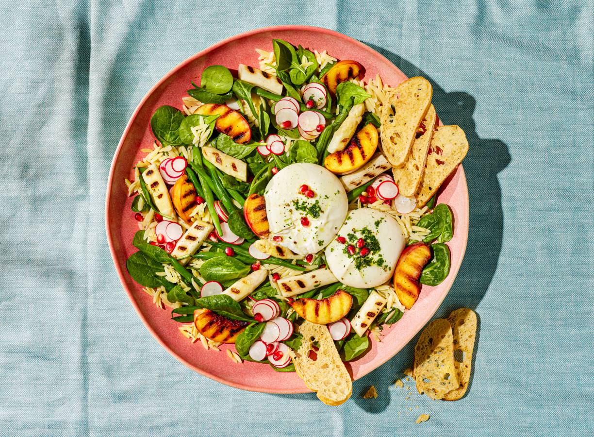 Verdeel de orzo, babyspinazie, sperziebonen, gegrilde asperges, gegrilde nectarines, croutons en radijsjes over een grote schaal. Leg de burrata’s in het midden en scheur een beetje open. Besprenkel met de dressing en bestrooi met de granaatappelpitjes.