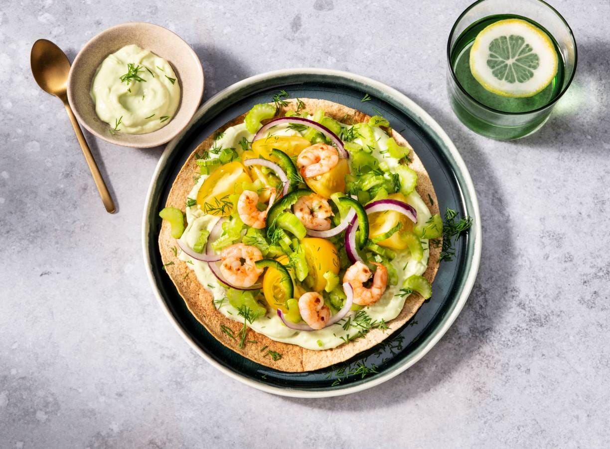 Crunchy tostada met frisse en licht-pittige salade van tomaten, bleekselderij, jalapeño, dille, rode ui en sappige garnalen: de ultieme combi tussen gezond en smaakvol!