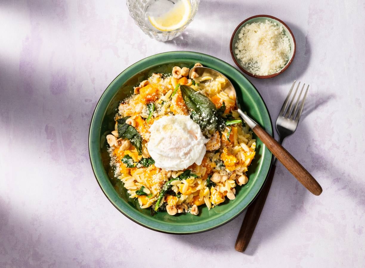 Romige orzo met zoete pompoen uit de oven, Grana Padano, een zacht gepocheerd eitje on top en afgemaakt met crunchy hazelnoten. Da’s pas comfortfood!