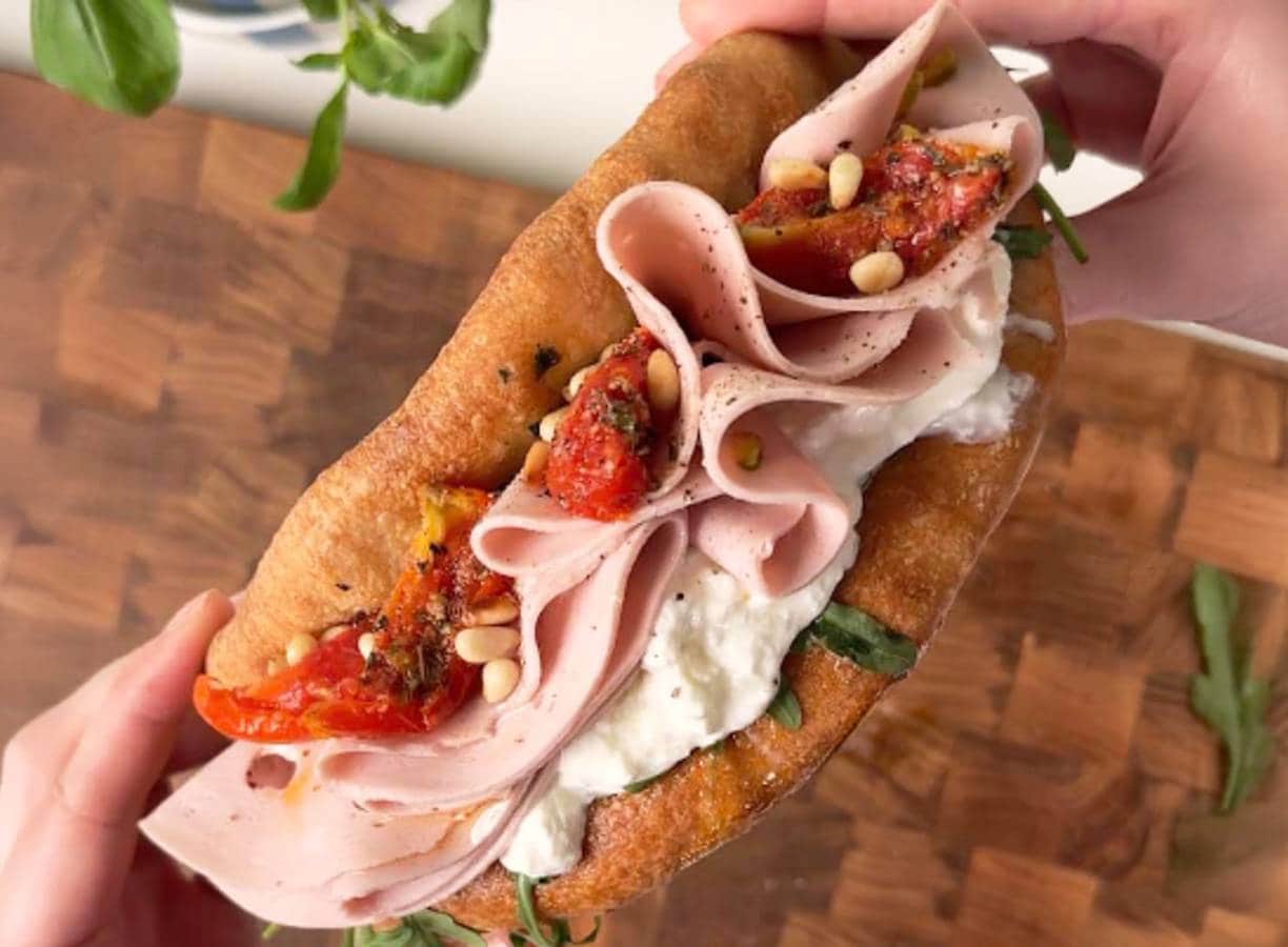 Zin in pizza, maar dan anders? Deze Italiaanse sandwich is jouw nieuwe lunchfavoriet: romige burrata, mortadella met pistache en geroosterde pijnboompitten.. Alle smaken van een pizza, maar dan next-level in een sandwich.